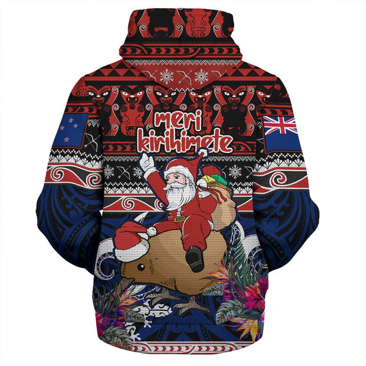 New Zealand Sherpa Hoodie Santa Riding Kiwi Bird Meri Kirihimete Ugly Christmas Maori Patterns