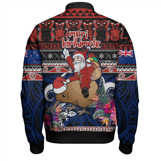New Zealand Bomber Jacket Santa Riding Kiwi Bird Meri Kirihimete Ugly Christmas Maori Patterns