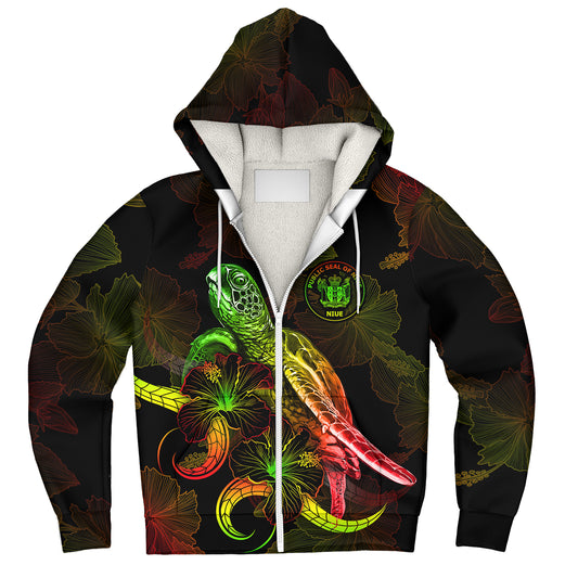 Niue Sherpa Hoodie Sea Turtle With Blooming Hibiscus Flowers Reggae
