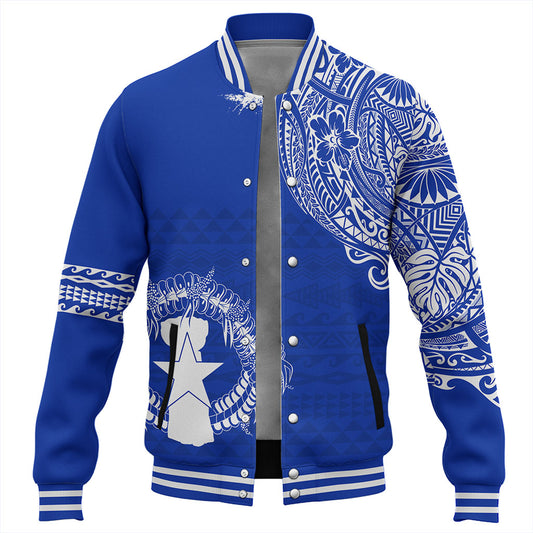 Northern Mariana Islands Baseball Jacket Custom CNMI Blood Inside Me Polynesian Sleeve Tattoo Tropical Blue