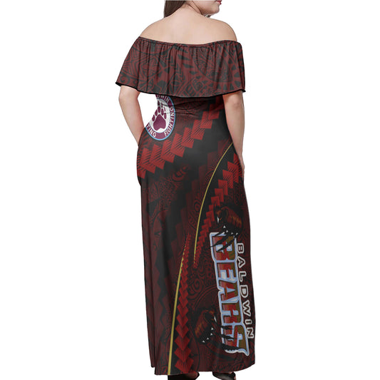 Baldwin High School Woman Off Shoulder Long Dress - Custom Baldwin Super Bears Polynesian Tribal Pattern Scratch Style