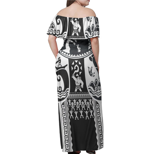 Maui Tattoo Polynesian Woman Off Shoulder Long Dress - Black and White Tribal Pattern