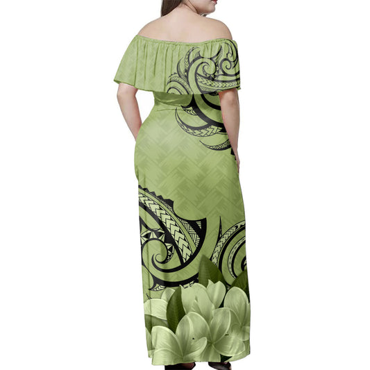 Polynesian Woman Off Shoulder Long Dress - Green Plumeria Polynesian Pattern