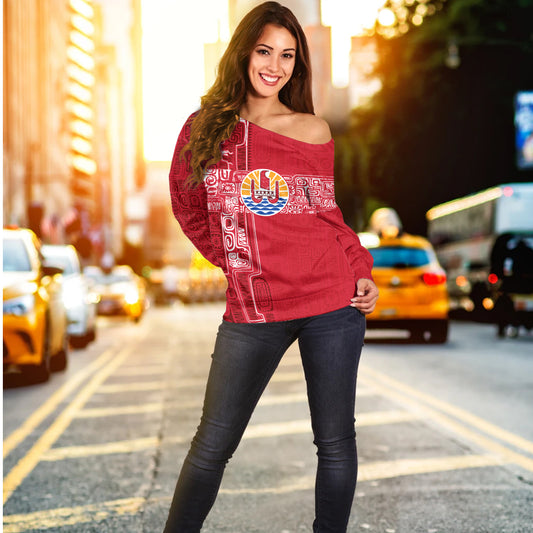 French Polynesia Off Shoulder Sweatshirt Tribal Pattern Tahiti Vintage Style