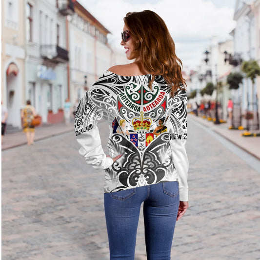 New Zealand Aotearoa Off Shoulder Sweatshirt Maori Traditional Hongi - The Breath Of Life Coat Of Arms Tribal Patterns