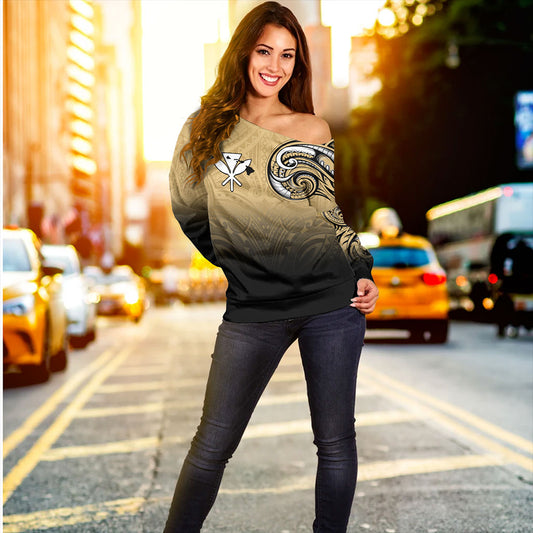 Hawaii Off Shoulder Sweatshirt Kanaka Map Polynesian Tribal Style