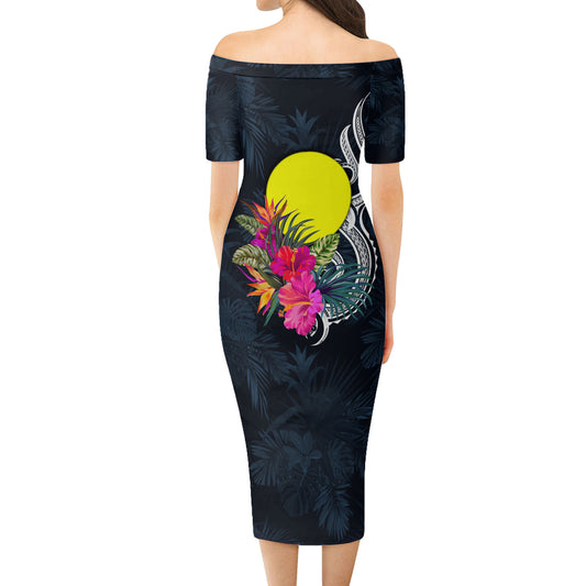 Palau Short Sleeve Off The Shoulder Lady Dress Sea Turtle With Blooming Hibiscus Flowers Tribal Blue