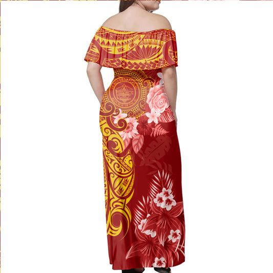 Palau Combo Off Shoulder Long Dress And Shirt Polynesian Tropical Plumeria Tribal Red