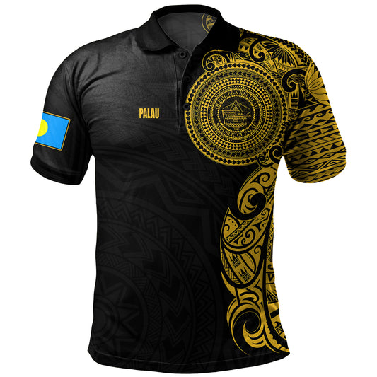 Palau Polo Shirt Custom Polynesian Half Sleeve Gold Tattoo With Seal Black