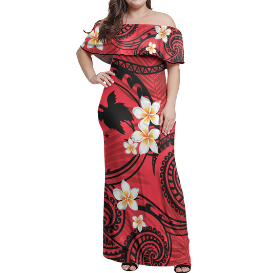 Papua New Guinea Off Shoulder Long Dress Polynesian Tropical Plumeria Tribal Red