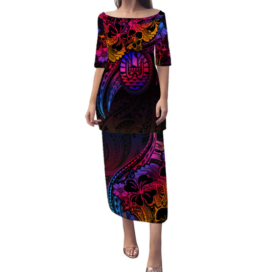 Tahiti Combo Puletasi And Shirt Polynesian Tribal Waves Patterns Hibiscus Flowers