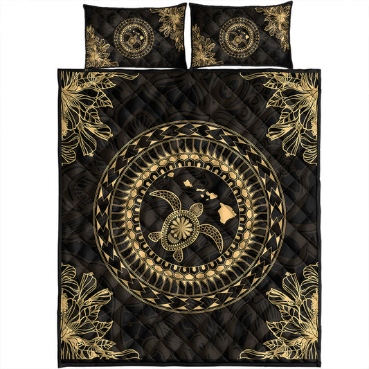 Hawaii Quilt Bed Set Turtle Polynesian Map Plumeria Gold