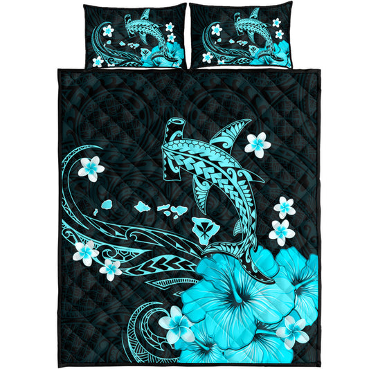 Hawaii Quilt Bed Set Kanaka Map And Shark Tribal Tattoo Turquoise