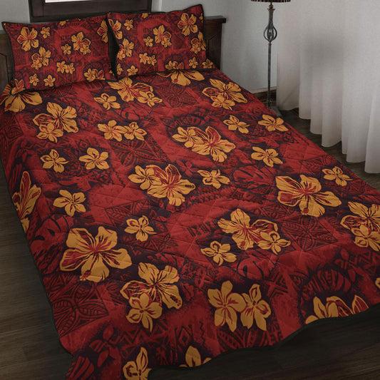 Hawaii Quilt Bed Set Polynesian Tribal And Hibiscus Vintage Red Gold