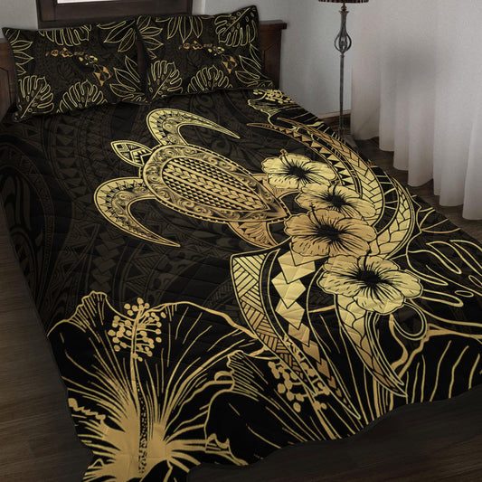 Hawaii Quilt Bed Set Tribal Polynesia Floral Gold Art