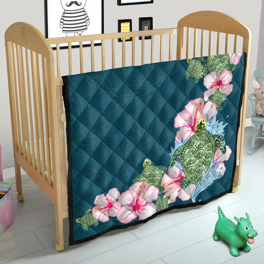 Hawaii Polynesian Premium Quilt - Turtle With Blooming Hibiscus Turquoise
