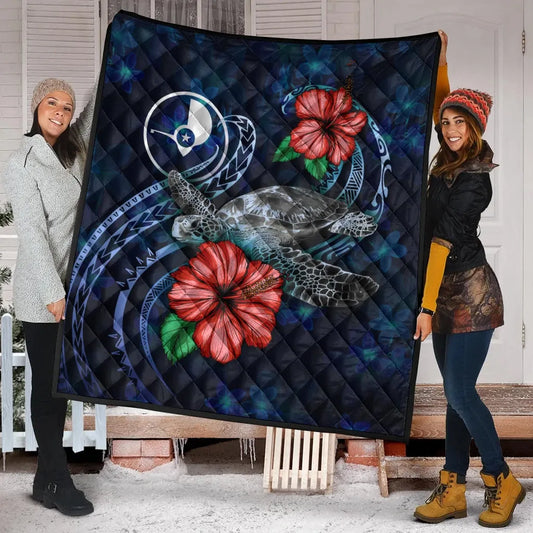 Yap Polynesian Premium Quilt - Blue Turtle Hibiscus