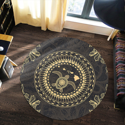 Hawaii Round Rug Turtle Polynesian Map Plumeria Gold
