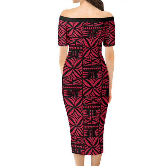 Samoa Short Sleeve Off The Shoulder Lady Dress Polynesian Tropical Plumeria Tribal Red