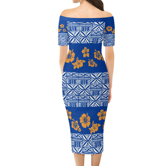 Samoa Short Sleeve Off The Shoulder Lady Dress Tapa Flower Fabric Print