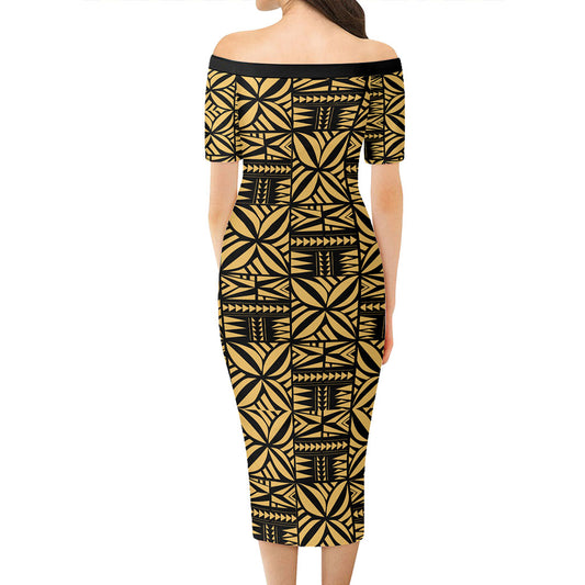 Samoa Short Sleeve Off The Shoulder Lady Dress Kakau Style Gold