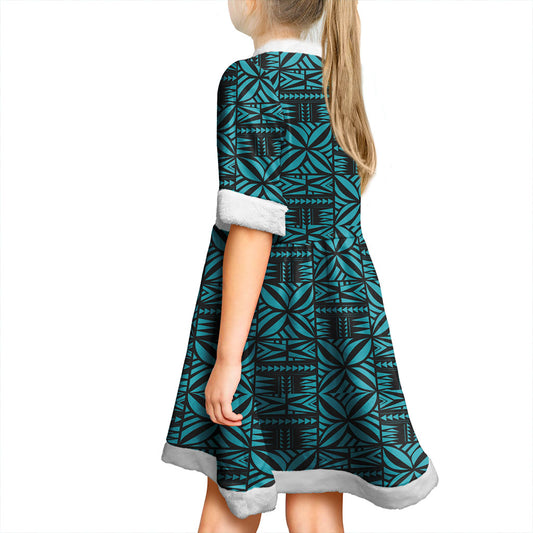 Samoa Women and Kid Christmas Dress Design Stretch Print Fabric Turquoise