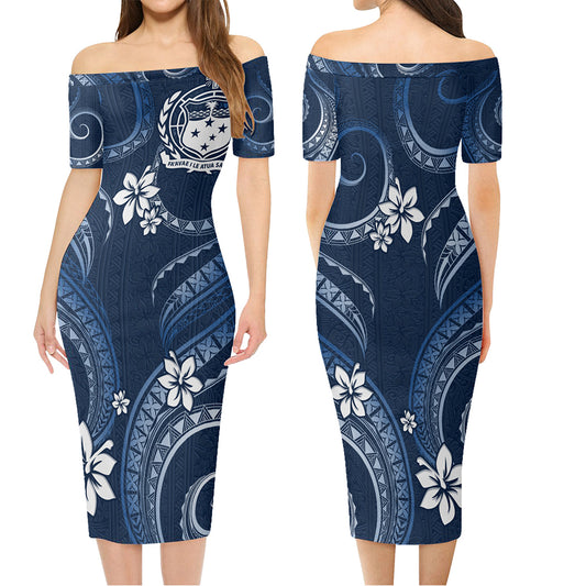 Samoa Combo Short Sleeve Dress And Shirt Hibiscus With Polynesian Pattern Blue Version