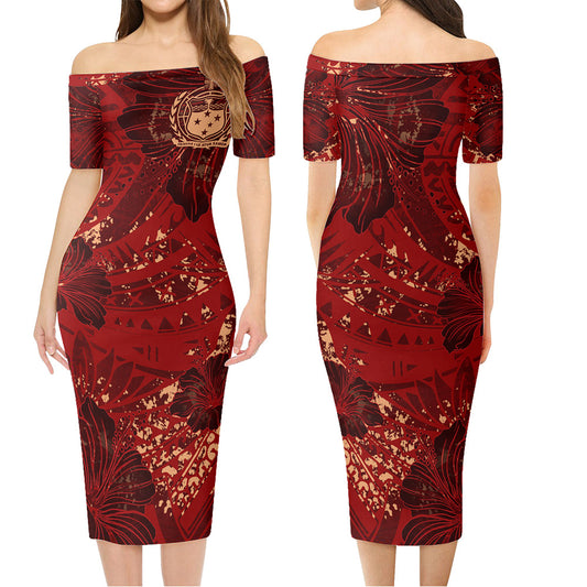Samoa Combo Short Sleeve Dress And Shirt Hibiscus With Polynesian Pattern Red Version