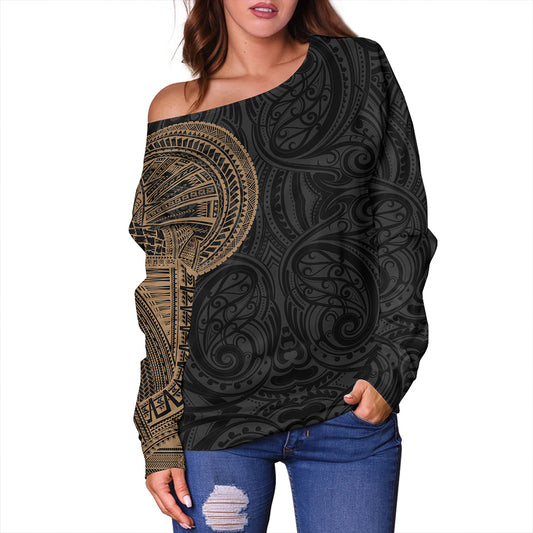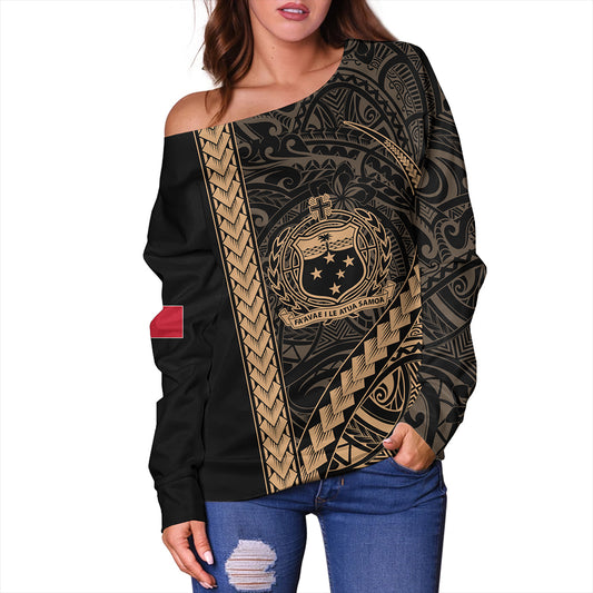 Samoa Off Shoulder Sweatshirt Tribal Polynesian Coat Of Arms Gold