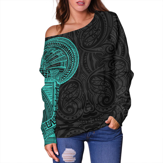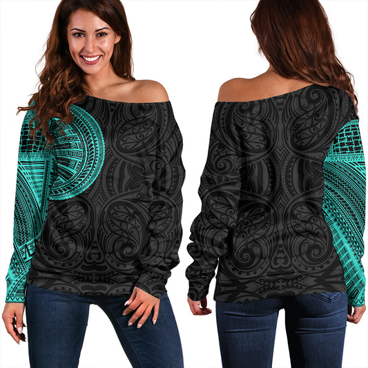 Samoa Tribal Maori Tattoo Roman Reigns Off Shoulder Sweatshirt Turquoise
