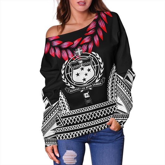 Samoa Polynesian Off Shoulder Sweatshirt - Samoa Coat Of Arms with Lauhala Tribal Pattern