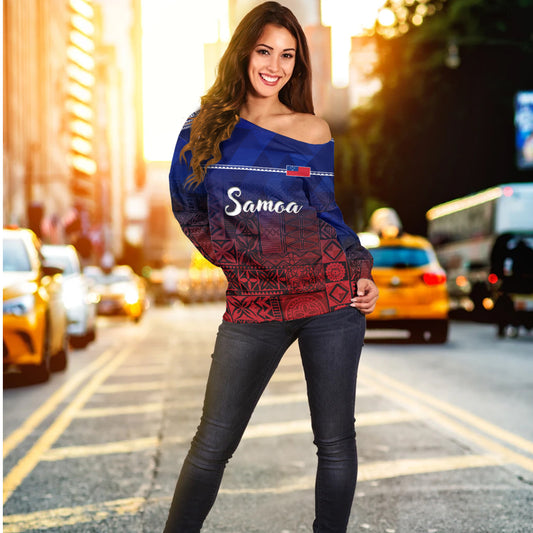 Samoa Off Shoulder Sweatshirt - Samoa Flag Color With Traditional Patterns