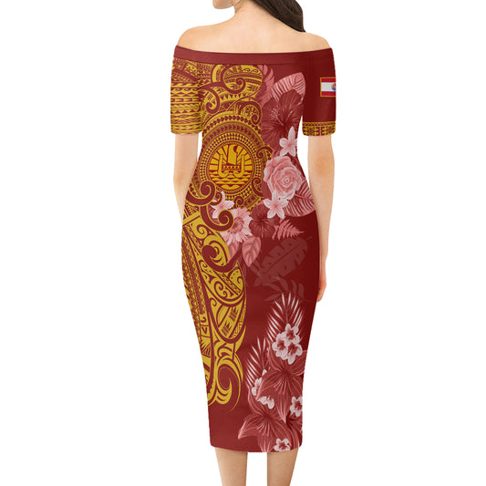 Austral Islands Short Sleeve Off The Shoulder Lady Dress Polynesian Tropical Plumeria Tribal Red