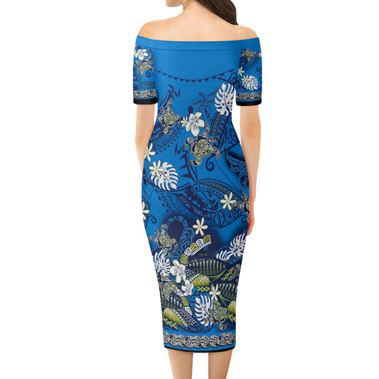 Hawaii Short Sleeve Off The Shoulder Lady Dress Polynesia Floral And Tribal Islands Blue