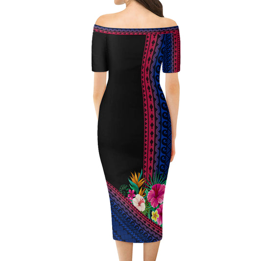 Philippines Filipinos Short Sleeve Off The Shoulder Lady Dress Lilies With Polynesian Pattern