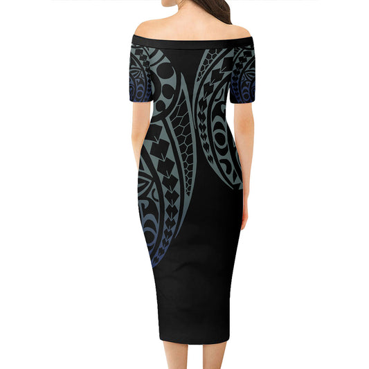 Marquesas Islands Short Sleeve Off The Shoulder Lady Dress Kakau Style Gradient Blue