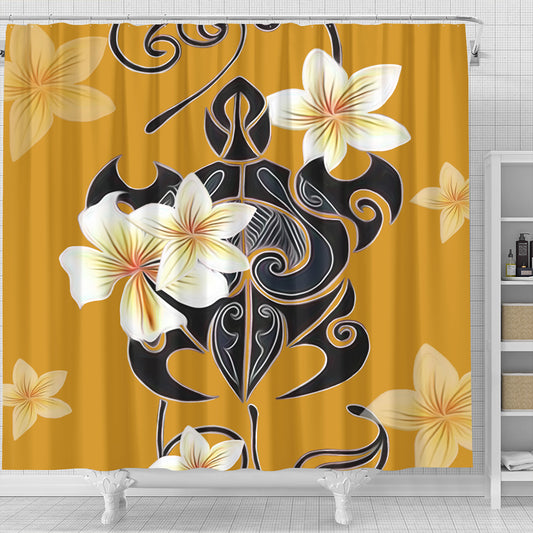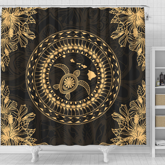 Hawaii Shower Curtain Turtle Polynesian Map Plumeria Gold