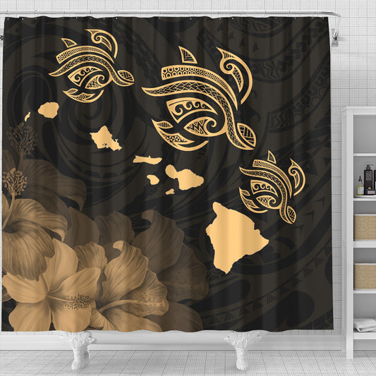 Hawaii Shower Curtain Turtle Hibiscus Map Polynesian Family Gold
