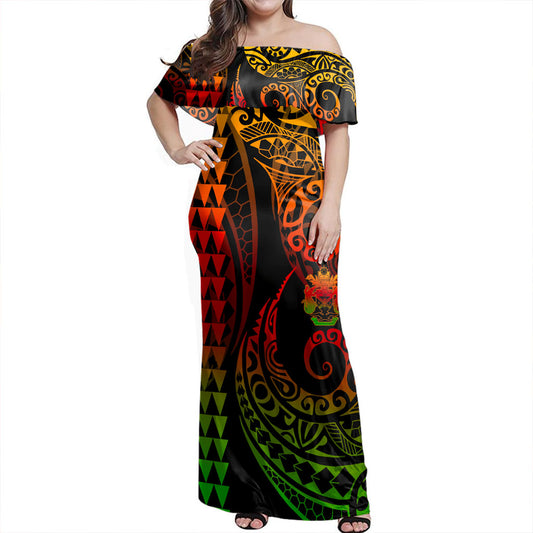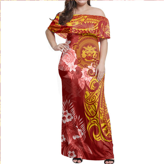 Solomon Islands Combo Off Shoulder Long Dress And Shirt Polynesian Tropical Plumeria Tribal Red