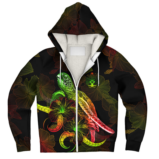 Solomon Islands Sherpa Hoodie Sea Turtle With Blooming Hibiscus Flowers Reggae