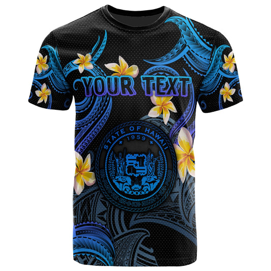 Hawaii T-shirt - Custom Personalised Polynesian Waves with Plumeria Flowers (Blue)