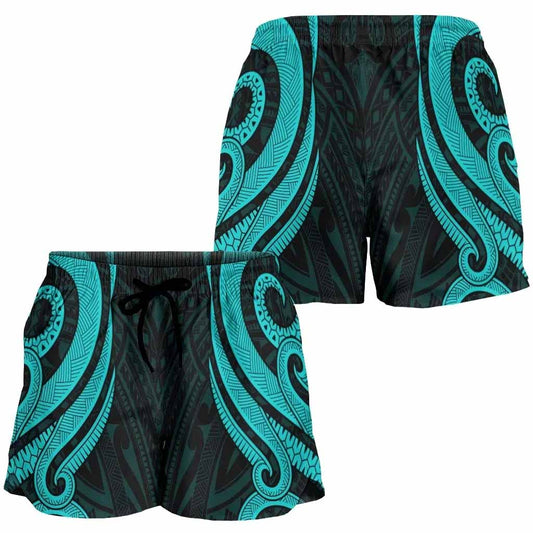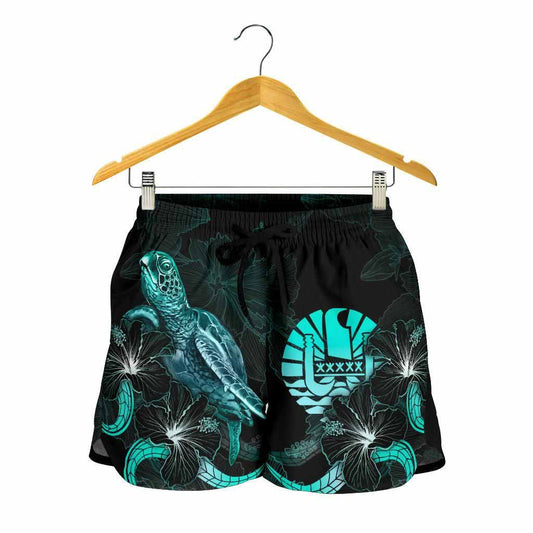 Tahiti Polynesian Women Shorts - Turtle With Blooming Hibiscus Turquoise