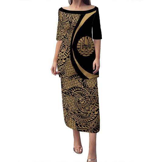 Tahiti Off Shoulder Long Dress Kakau Style Gold