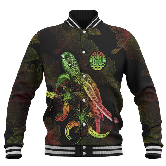 Tahiti Baseball Jacket Sea Turtle With Blooming Hibiscus Flowers Reggae