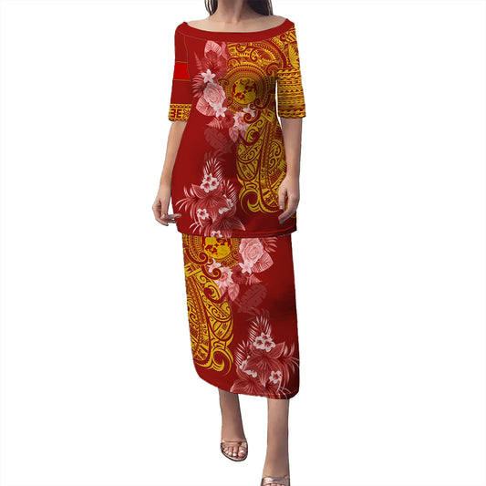 Tonga Combo Puletasi And Shirt Polynesian Tropical Plumeria Tribal Red