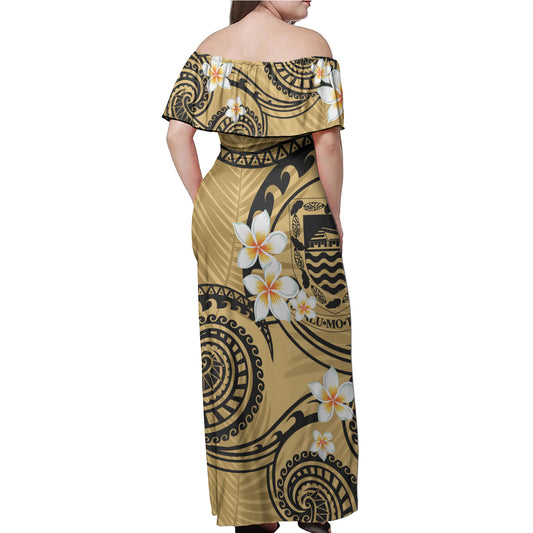 Tuvalu Off Shoulder Long Dress Plumeria Flowers Tribal Motif Yellow Version