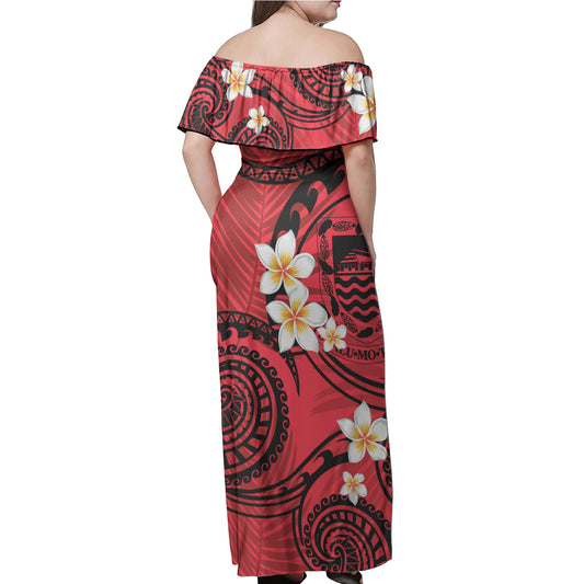 Tuvalu Off Shoulder Long Dress Plumeria Flowers Tribal Motif Red Version