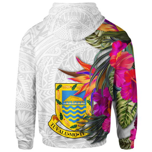 Tuvalu Hoodie -Tuvalu Coat of Arms & Polynesian Tropical Flowers White