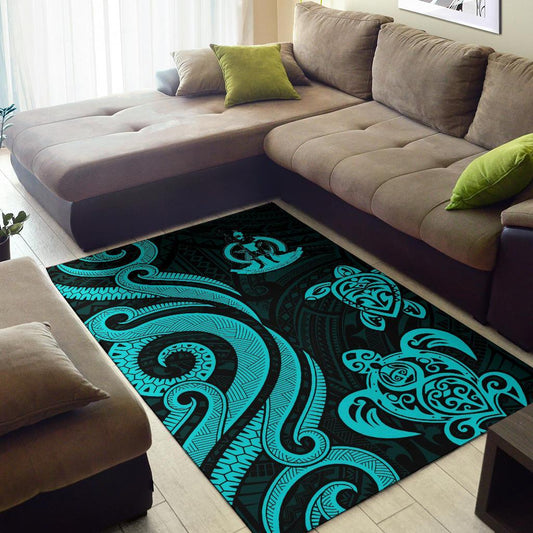 Wallis and Futuna Polynesian Area Rugs - Turtle With Blooming Hibiscus Turquoise