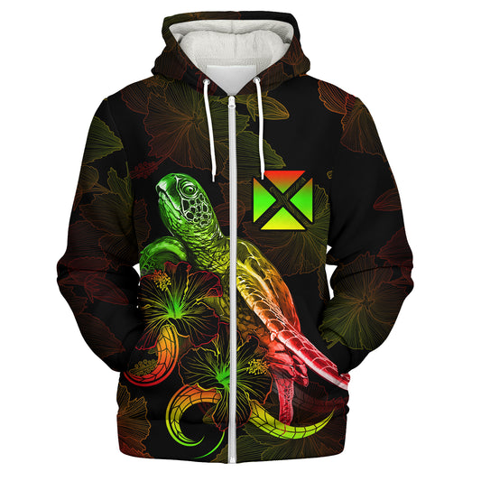 Wallis And Futuna Sherpa Hoodie Sea Turtle With Blooming Hibiscus Flowers Reggae